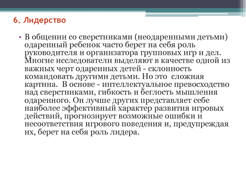 и дел. Многие исследователи выделяют в качестве одной из важных черт одаренных детей - склонность командовать другими детьми. Но это сложная картина. В основе - интеллектуальное превосходство над сверстниками, гибкость и беглость мышления одаренного. Он лучше других представляет себе наиболее эффективный характер развития игровых действий, прогнозирует возможные ошибки и несоответствия игрового поведения и, предупреждая их, берет на себя роль лидера.