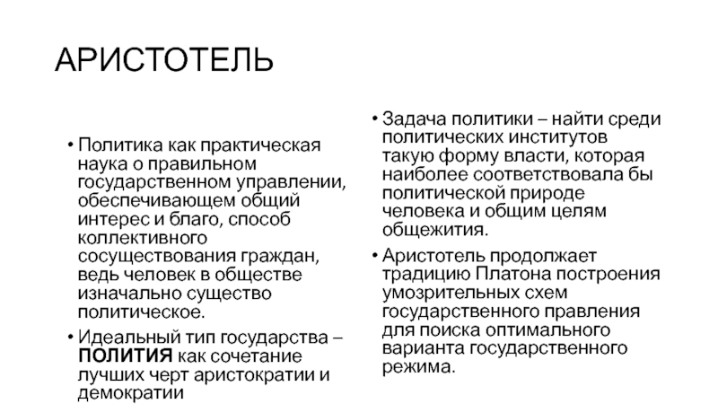Задача политики – найти среди политических институтов такую форму власти, которая наиболее соответствовала бы политической природе человека и общим целям общежития.
