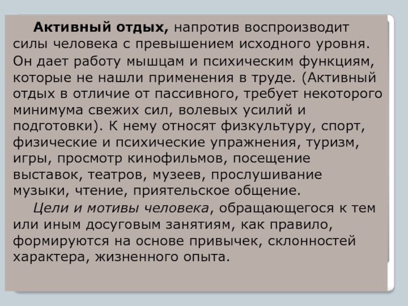 Слайд 8Пассивный отдых характеризуется состоянием покоя, которое снимает утомление и восстанавливает