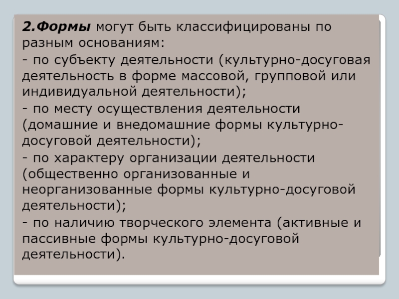 деятельности (культурно-досуговая деятельность в форме массовой, групповой или индивидуальной деятельности);