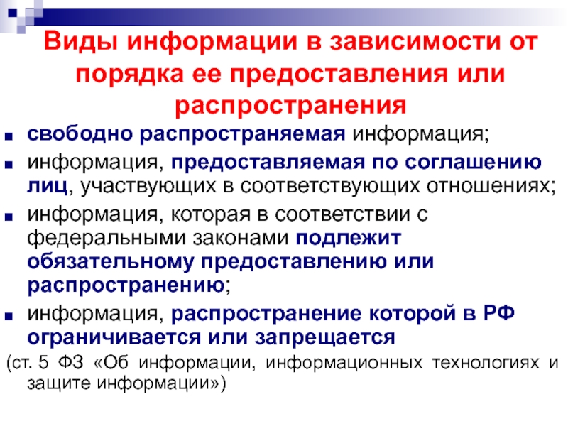 Слайд 25Виды информации в зависимости от порядка ее предоставления или распространения