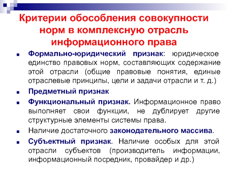 Слайд 4Критерии обособления совокупности норм в комплексную отрасль информационного права