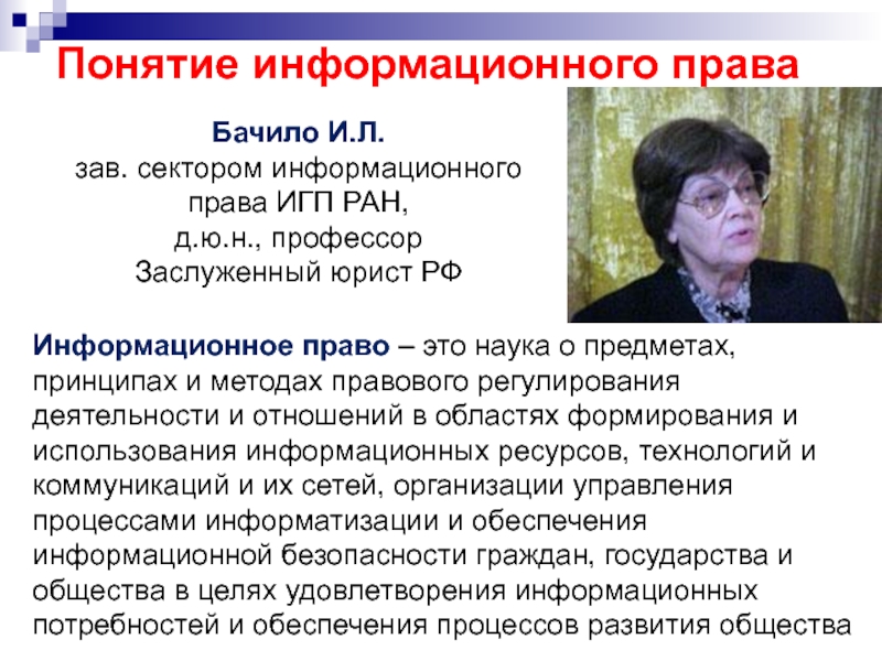 и методах правового регулирования деятельности и отношений в областях формирования и использования информационных ресурсов, технологий и коммуникаций и их сетей, организации управления процессами информатизации и обеспечения информационной безопасности граждан, государства и общества в целях удовлетворения информационных потребностей и обеспечения процессов развития общества
