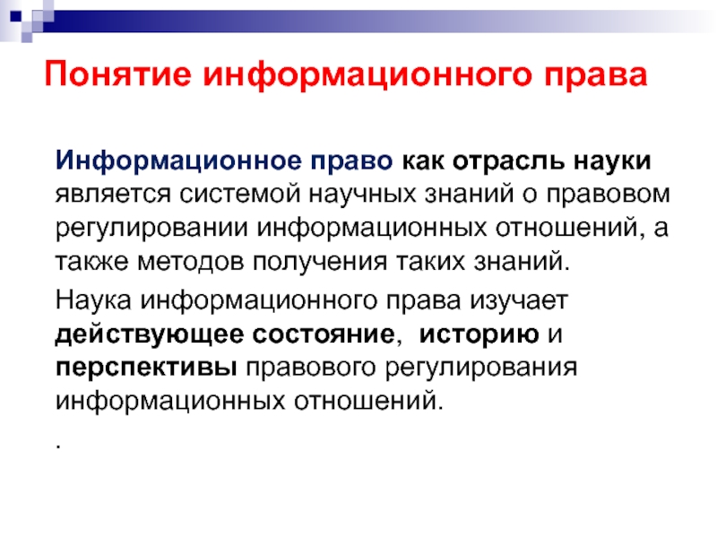 Наука информационного права изучает действующее состояние, историю и перспективы правового регулирования информационных отношений.