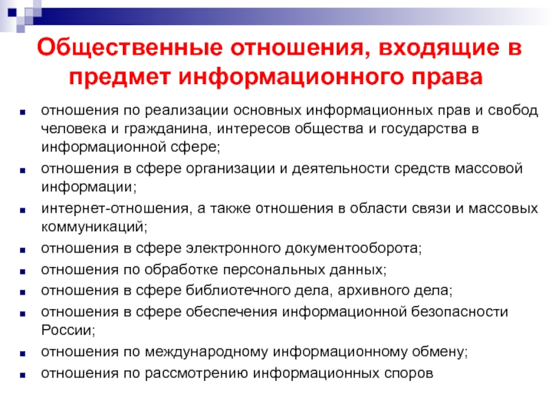 Слайд 11Общественные отношения, входящие в предмет информационного права