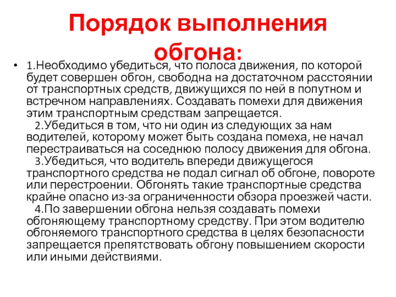 4.По завершении обгона нельзя создавать помехи обгоняющему транспортному средству. При этом водителю обгоняемого транспортного средства в целях безопасности запрещается препятствовать обгону повышением скорости или иными действиями.
