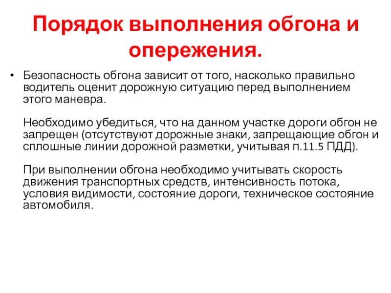 При выполнении обгона необходимо учитывать скорость движения транспортных средств, интенсивность потока, условия видимости, состояние дороги, техническое состояние автомобиля.