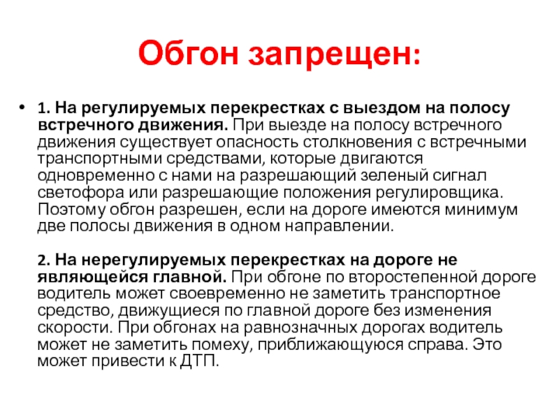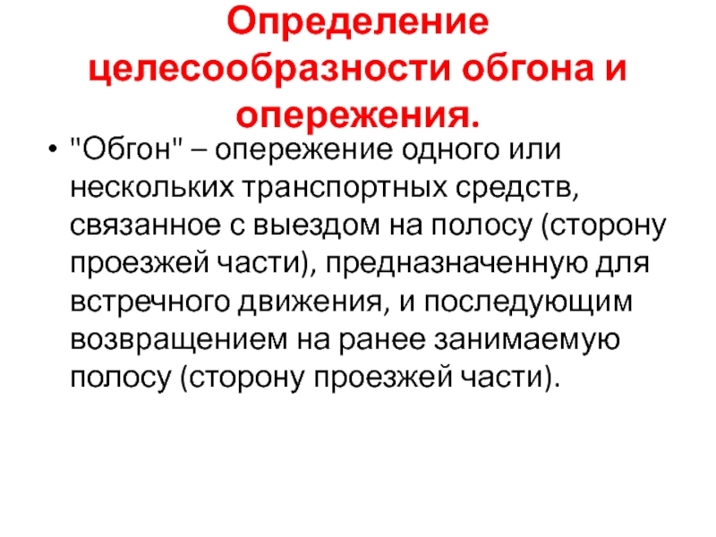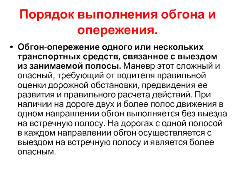 требующий от водителя правильной оценки дорожной обстановки, предвидения ее развития и правильного расчета действий. При наличии на дороге двух и более полос движения в одном направлении обгон выполняется без выезда на встречную полосу. На дорогах с одной полосой в каждом направлении обгон осуществляется с выездом на встречную полосу и является более опасным.