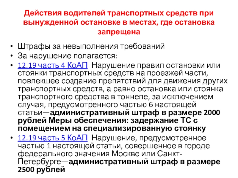 Слайд 17Действия водителей транспортных средств при вынужденной остановке в местах, где