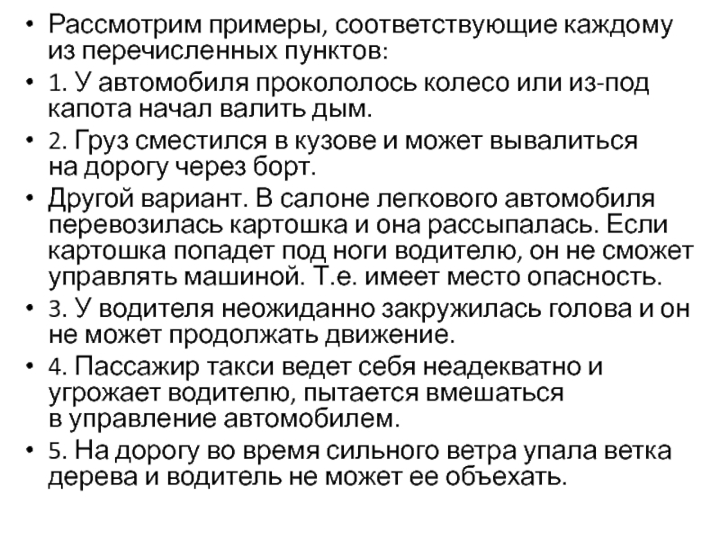 технической неисправности или опасности, создаваемой перевозимым грузом, состоянием водителя (пассажира) или появлением препятствия на дороге.