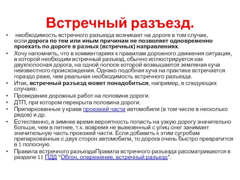 Правила встречного разъездаПравила встречного разъезда рассматриваются в разделе 11 ПДД "Обгон, опережение, встречный разъезд".
