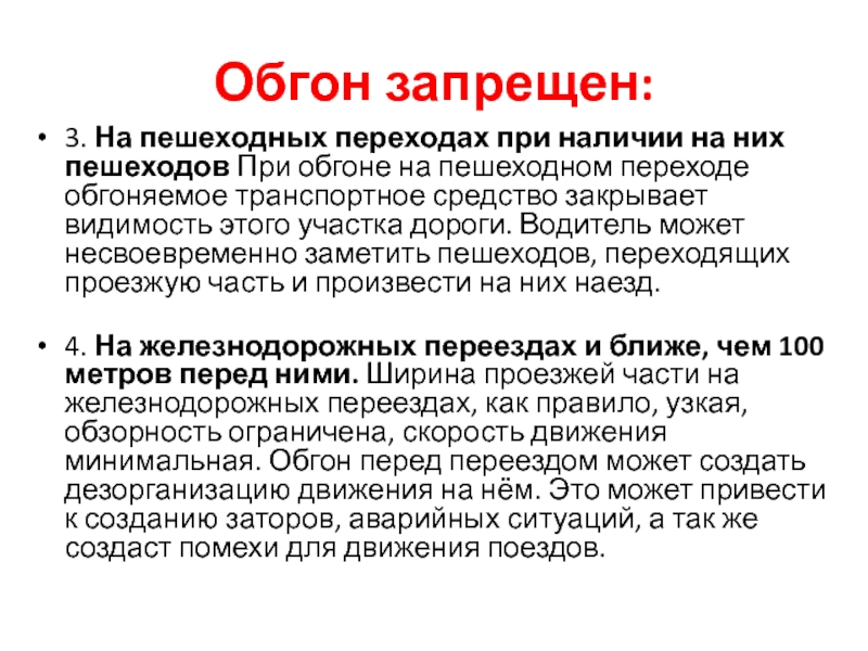 4. На железнодорожных переездах и ближе, чем 100 метров перед ними. Ширина проезжей части на железнодорожных переездах, как правило, узкая, обзорность ограничена, скорость движения минимальная. Обгон перед переездом может создать дезорганизацию движения на нём. Это может привести к созданию заторов, аварийных ситуаций, а так же создаст помехи для движения поездов.