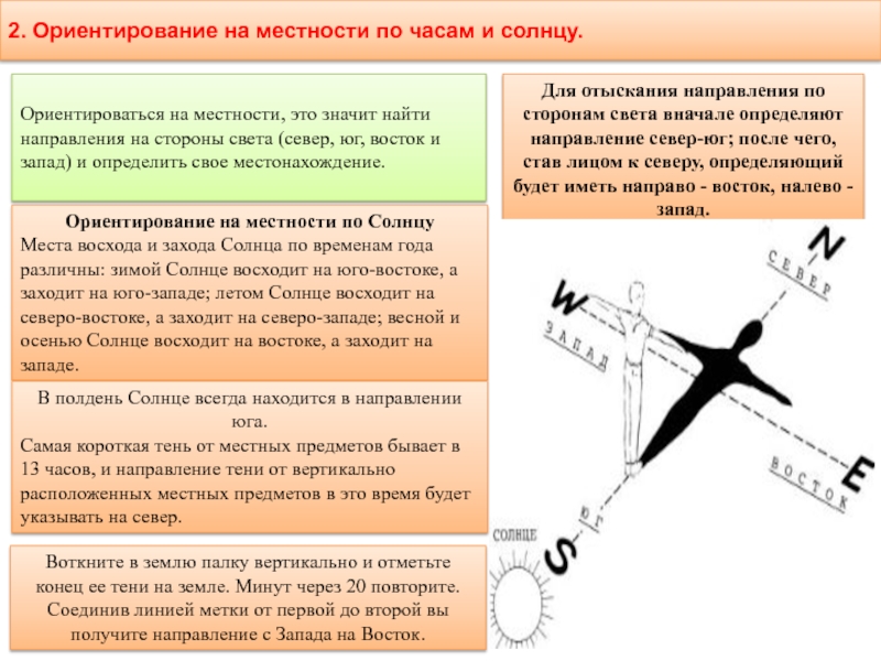 Для отыскания направления по сторонам света вначале определяют направление север-юг; после чего, став лицом к северу, определяющий будет иметь направо - восток, налево - запад.