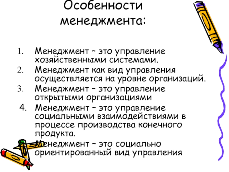 Менеджмент – это управление социальными взаимодействиями в процессе производства конечного продукта.5. Менеджмент – это социально ориентированный вид управления