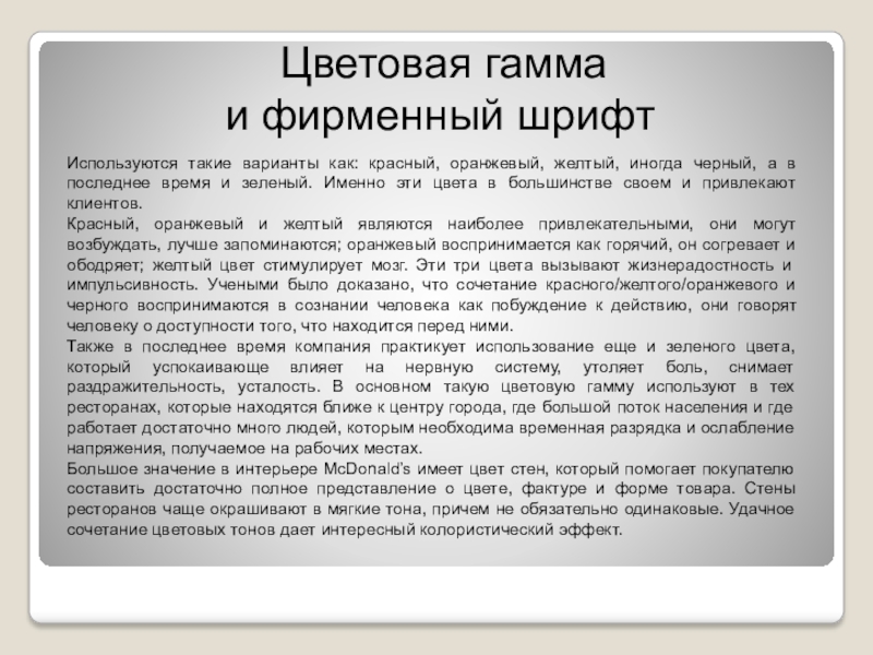 Большое значение в интерьере McDonald’s имеет цвет стен, который помогает покупателю составить достаточно полное представление о цвете, фактуре и форме товара. Стены ресторанов чаще окрашивают в мягкие тона, причем не обязательно одинаковые. Удачное сочетание цветовых тонов дает интересный колористический эффект.
