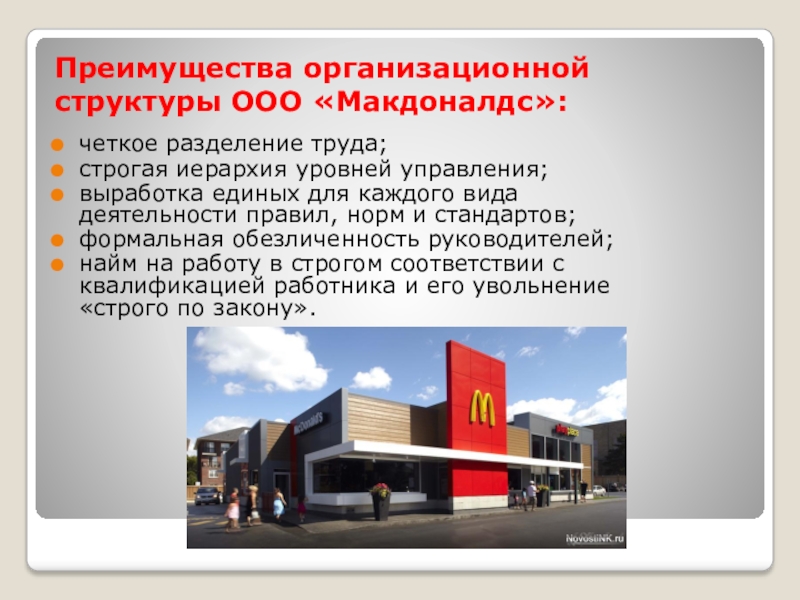 Слайд 8Преимущества организационной структуры ООО «Макдоналдс»: