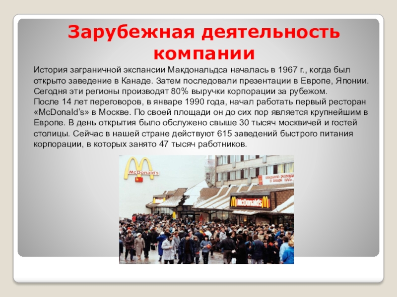 История заграничной экспансии Макдональдса началась в 1967 г.,