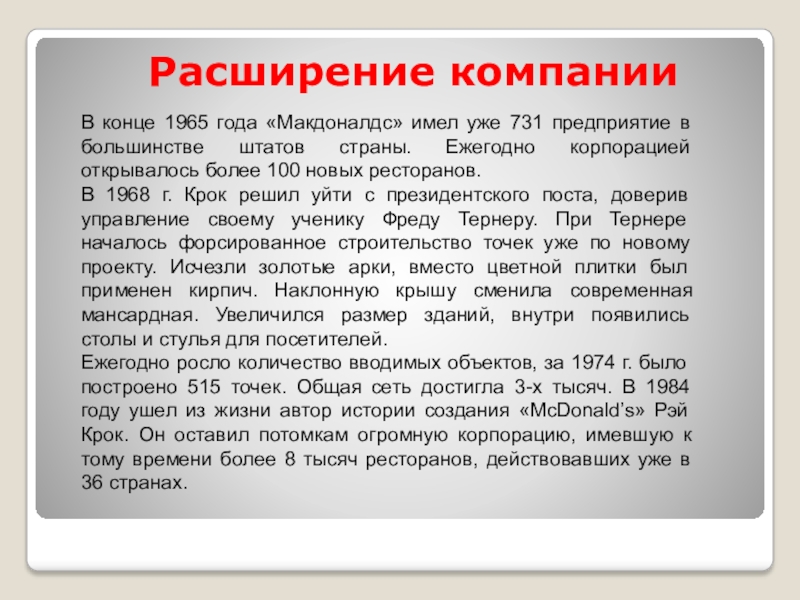 Ежегодно росло количество вводимых объектов, за 1974 г. было построено 515 точек. Общая сеть достигла 3-х тысяч. В 1984 году ушел из жизни автор истории создания «McDonald’s» Рэй Крок. Он оставил потомкам огромную корпорацию, имевшую к тому времени более 8 тысяч ресторанов, действовавших уже в 36 странах.