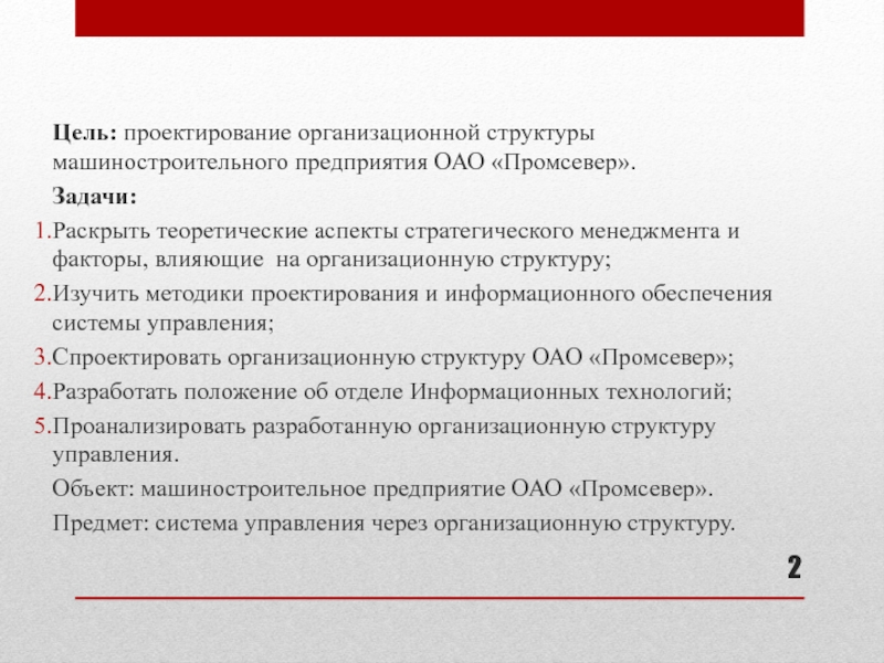 Цель: проектирование организационной структуры машиностроительного предприятия ОАО «Промсевер». Задачи:Раскрыть теоретические аспекты стратегического менеджмента и факторы, влияющие на организационную структуру;Изучить методики проектирования и информационного обеспечения системы управления;Спроектировать организационную структуру ОАО «Промсевер»;Разработать положение