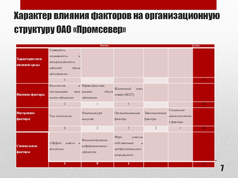 Слайд 7Характер влияния факторов на организационную структуру ОАО «Промсевер»