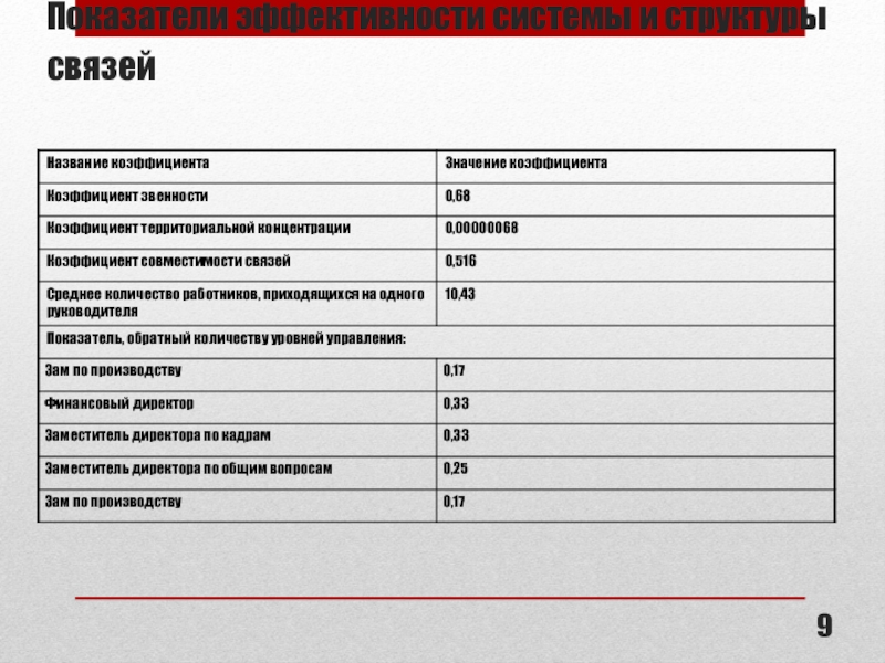 Слайд 9Показатели эффективности системы и структуры связей