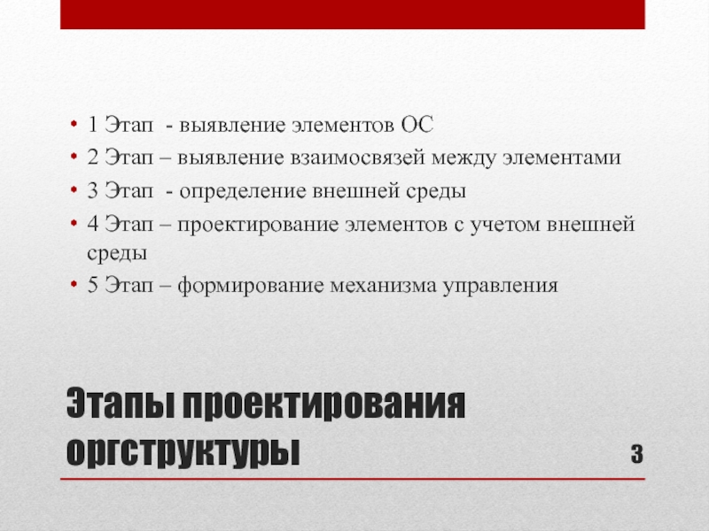 Этапы проектирования оргструктуры1 Этап - выявление элементов ОС2 Этап – выявление взаимосвязей между элементами3 Этап - определение