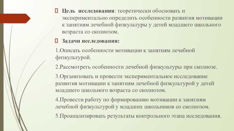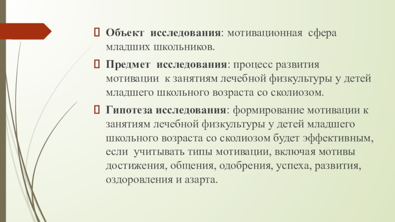 Гипотеза исследования: формирование мотивации к занятиям лечебной физкультуры у детей младшего школьного возраста со сколиозом будет эффективным, если учитывать типы мотивации, включая мотивы достижения, общения, одобрения, успеха, развития, оздоровления и азарта.