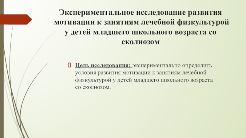 Слайд 11Экспериментальное исследование развития мотивации к занятиям лечебной физкультурой у детей