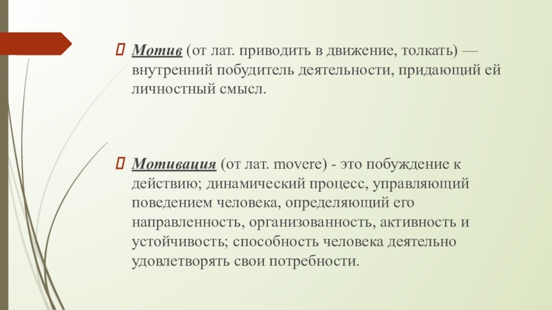 Слайд 5Мотив (от лат. приводить в движение, толкать) — внутренний побудитель