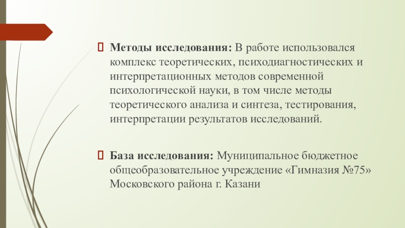 Слайд 4Методы исследования: В работе использовался комплекс теоретических, психодиагностических и интерпретационных