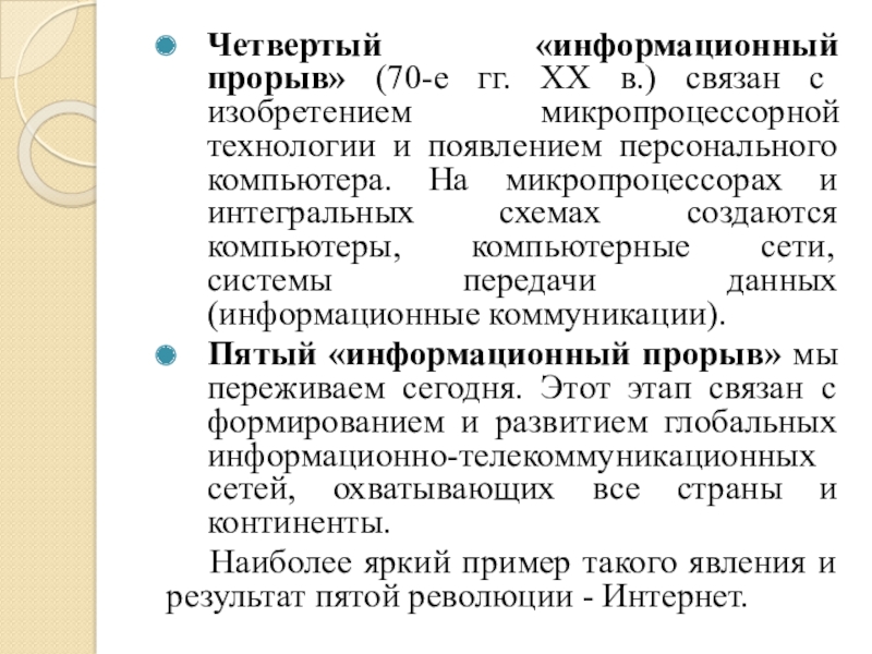 Слайд 6Четвертый «информационный прорыв» (70-е гг. XX в.) связан с изобретением