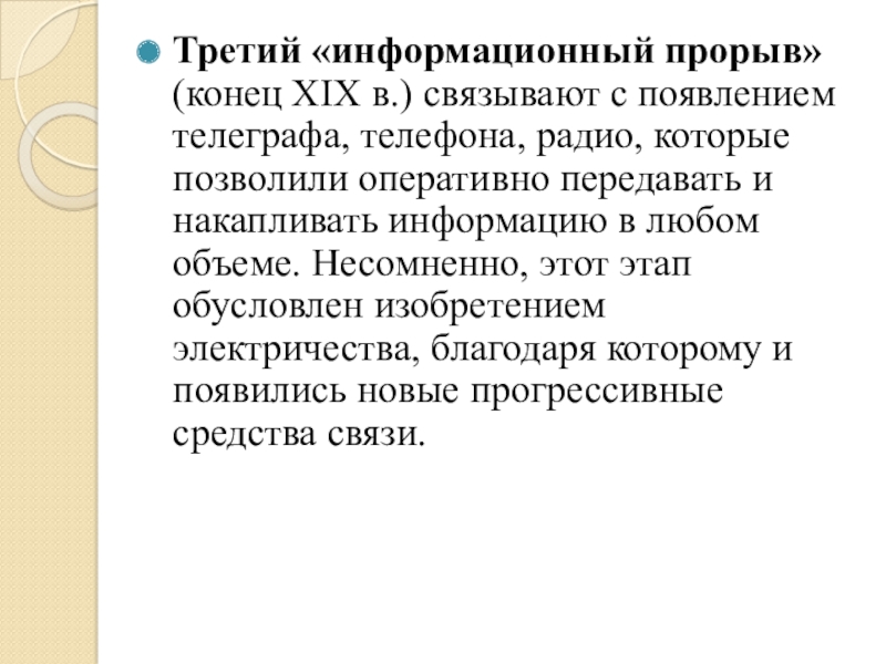 Слайд 5Третий «информационный прорыв» (конец XIX в.) связывают с появлением телеграфа,