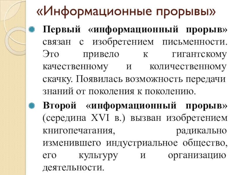 Первый «информационный прорыв» связан с изобретением письменности. Это привело