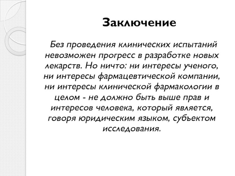 Без проведения клинических испытаний невозможен прогресс в разработке новых лекарств. Но ничто: ни интересы ученого, ни интересы фармацевтической компании, ни интересы клинической фармакологии в целом - не должно быть выше прав и интересов человека, который является, говоря юридическим языком, субъектом