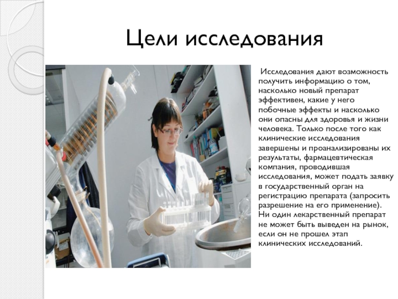 какие у него побочные эффекты и насколько они опасны для здоровья и жизни человека. Только после того как клинические исследования завершены и проанализированы их результаты, фармацевтическая компания, проводившая исследования, может подать заявку в государственный орган на регистрацию препарата (запросить разрешение на его применение). Ни один лекарственный препарат не может быть выведен на рынок, если он не прошел этап клинических исследований.