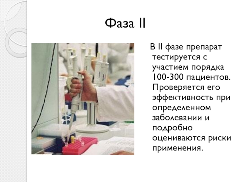 В II фазе препарат тестируется с участием порядка 100-300 пациентов.