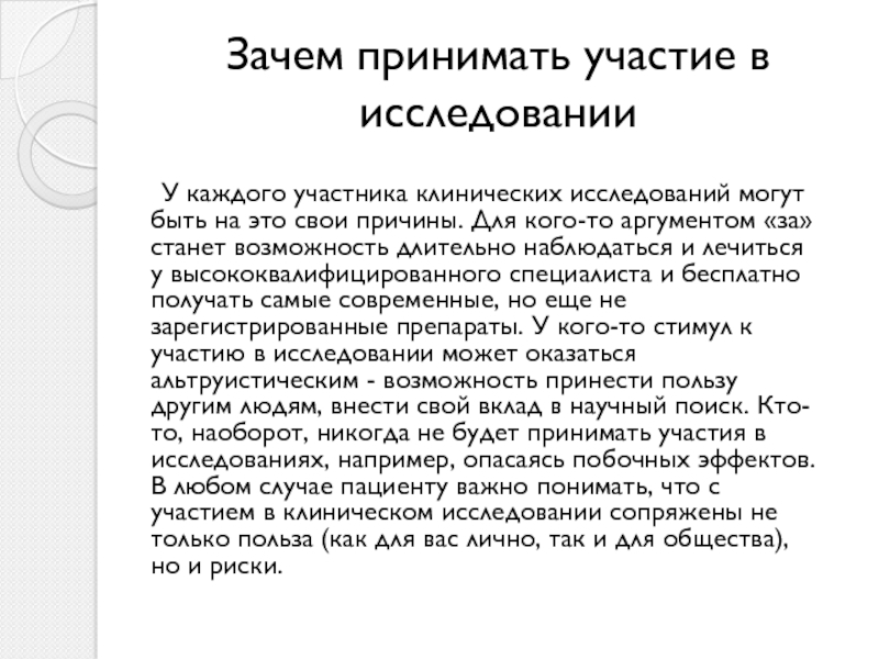 аргументом «за» станет возможность длительно наблюдаться и лечиться у высококвалифицированного специалиста и бесплатно получать самые современные, но еще не зарегистрированные препараты. У кого-то стимул к участию в исследовании может оказаться альтруистическим - возможность принести пользу другим людям, внести свой вклад в научный поиск. Кто-то, наоборот, никогда не будет принимать участия в исследованиях, например, опасаясь побочных эффектов. В любом случае пациенту важно понимать, что с участием в клиническом исследовании сопряжены не только польза (как для вас лично, так и для общества), но и риски.