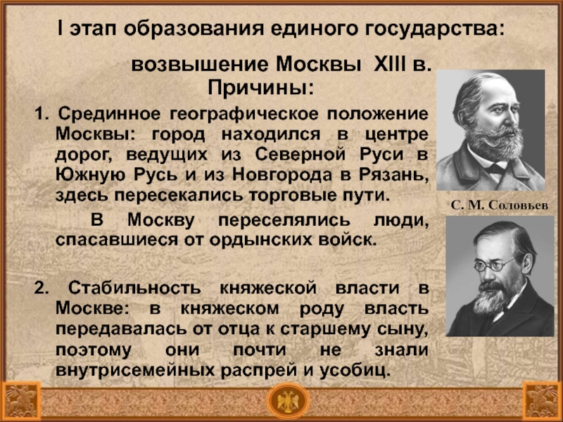 2. Стабильность княжеской власти в Москве: в княжеском роду власть передавалась от отца к старшему сыну, поэтому они почти не знали внутрисемейных распрей и усобиц.