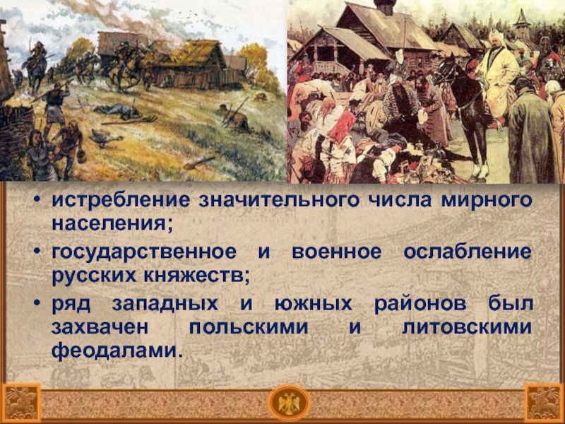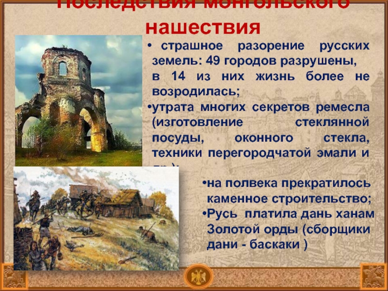 Русь платила дань ханам Золотой орды (сборщики дани - баскаки )