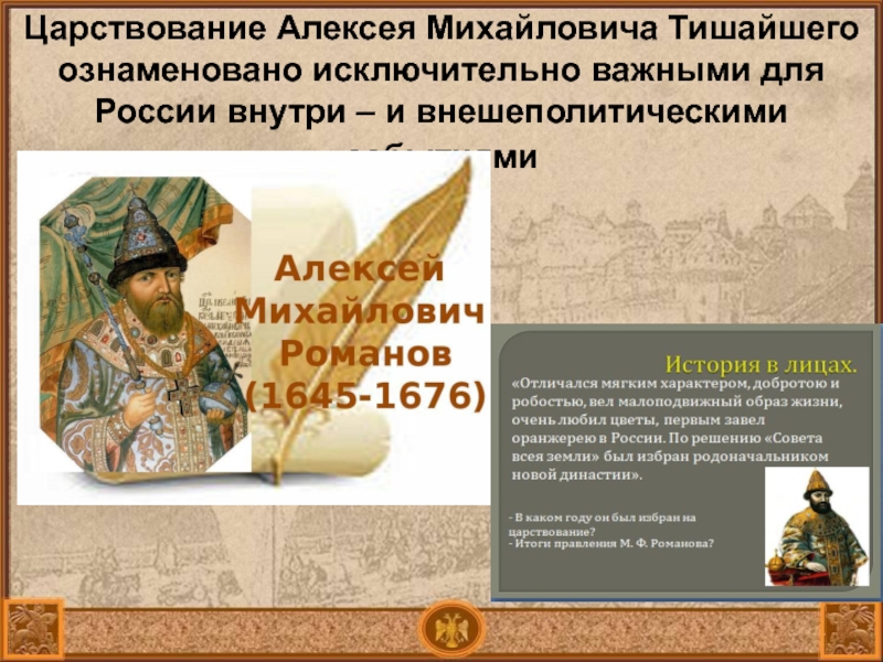 Слайд 51Царствование Алексея Михайловича Тишайшего ознаменовано исключительно важными для России внутри