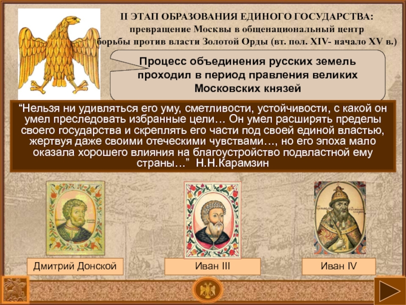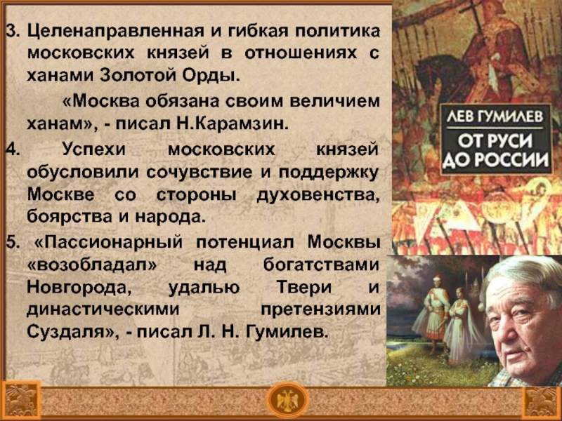5. «Пассионарный потенциал Москвы «возобладал» над богатствами Новгорода, удалью Твери и династическими претензиями Суздаля», - писал Л. Н. Гумилев.