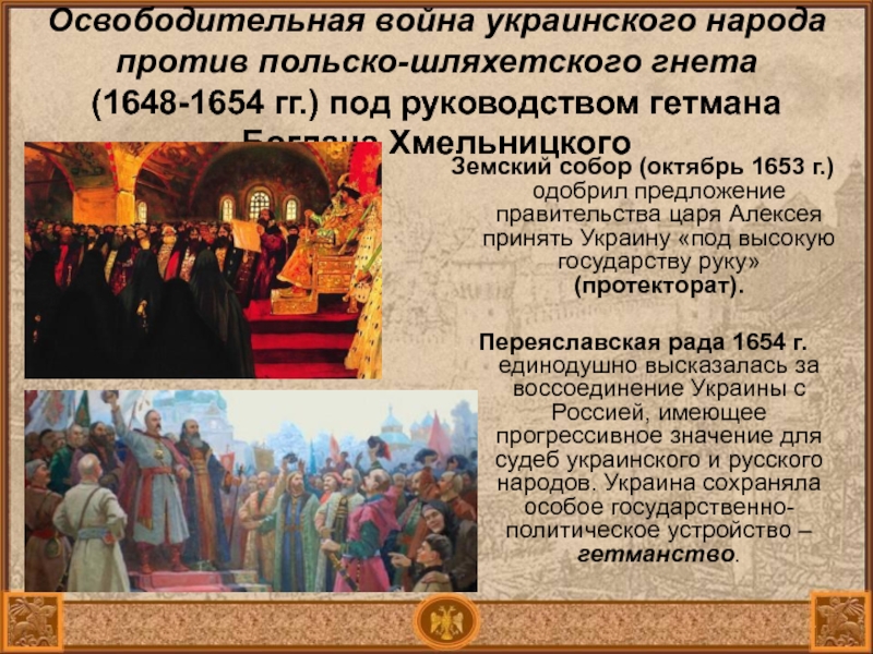 Переяславская рада 1654 г. единодушно высказалась за воссоединение Украины с Россией, имеющее прогрессивное значение для судеб украинского и русского народов. Украина сохраняла особое государственно-политическое устройство – гетманство.