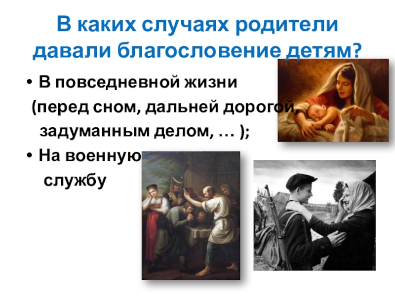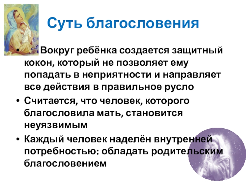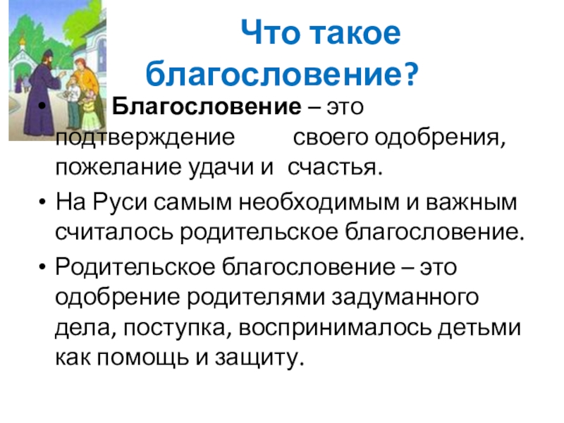 Родительское благословение – это одобрение родителями задуманного дела, поступка, воспринималось детьми как помощь и защиту.