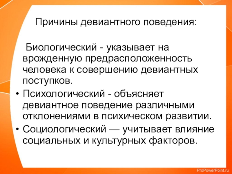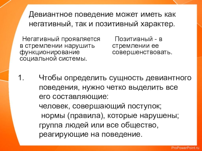 Чтобы определить сущность девиантного поведения, нужно четко выделить все его составляющие: