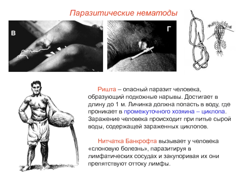 Нитчатка Банкрофта вызывает у человека «слоновую болезнь», паразитируя в лимфатических сосудах и закупоривая их они препятствуют оттоку лимфы.