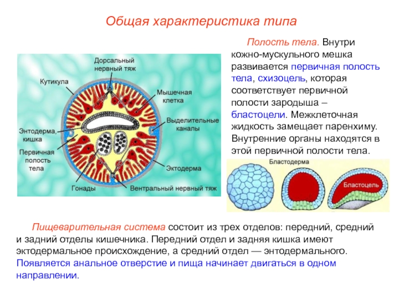 Полость тела. Внутри кожно-мускульного мешка развивается первичная полость тела, схизоцель, которая соответствует первичной полости зародыша – бластоцели. Межклеточная жидкость замещает паренхиму. Внутренние органы находятся в этой первичной полости тела.