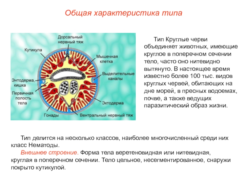 Тип Круглые черви объединяет животных, имеющие круглое в поперечном сечении тело, часто оно нитевидно вытянуто. В настоящее время известно более 100 тыс. видов круглых червей, обитающих на дне морей, в пресных водоемах, почве, а также ведущих паразитический образ жизни.