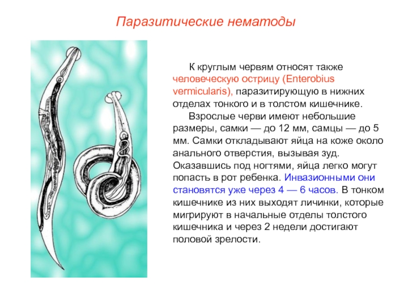 Слайд 17К круглым червям относят также человеческую острицу (Enterobius vermicularis), паразитирующую