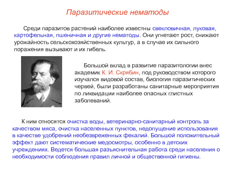 Слайд 20Большой вклад в развитие паразитологии внес академик К. И. Скрябин,