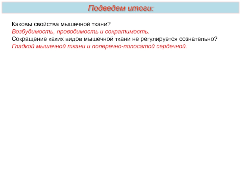 Мышечные ткани. Обладают свойствами возбудимости, проводимости и сократимости. Различают: поперечно-полосатую скелетную, поперечно-полосатую сердечную, гладкую мышечную ткань.